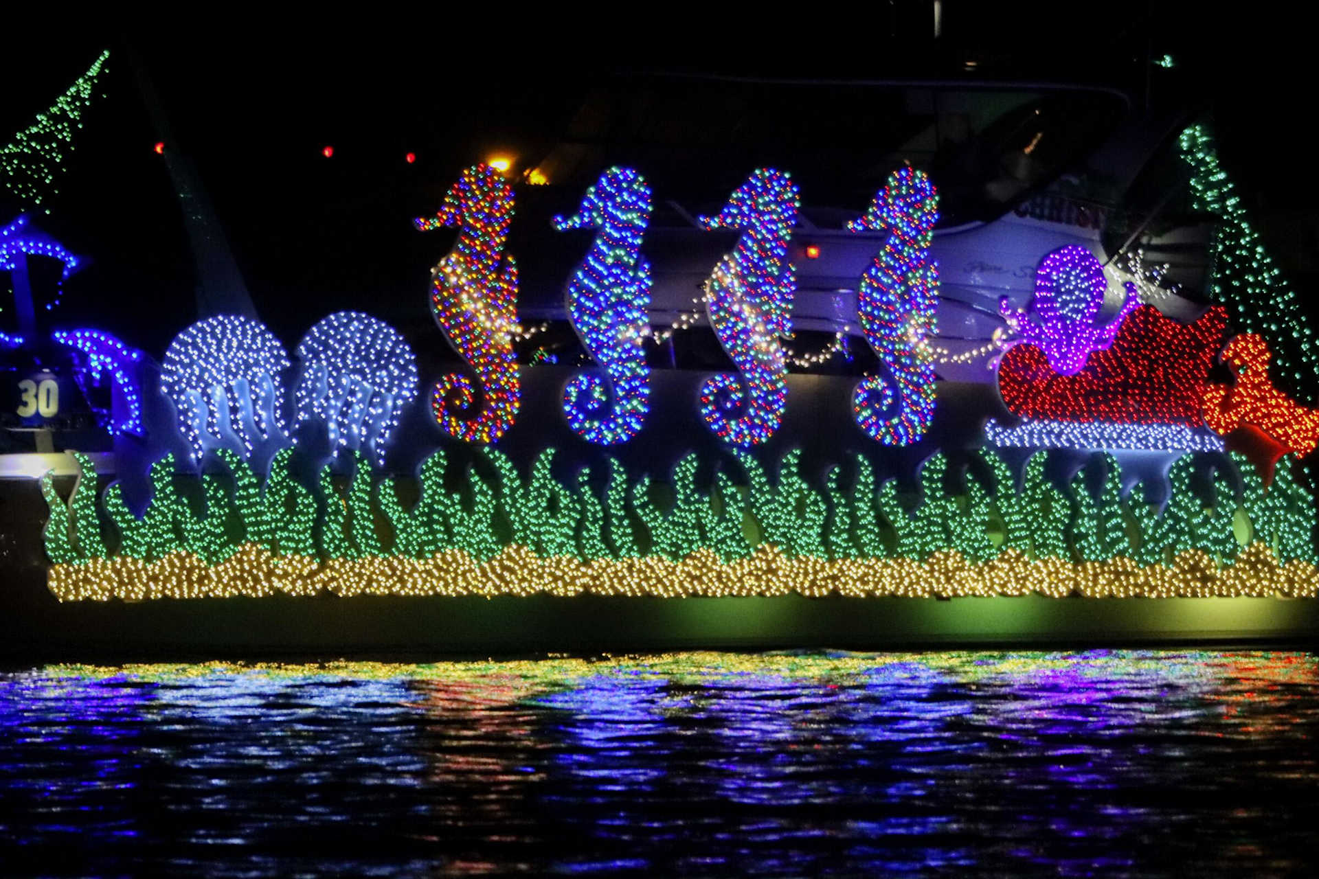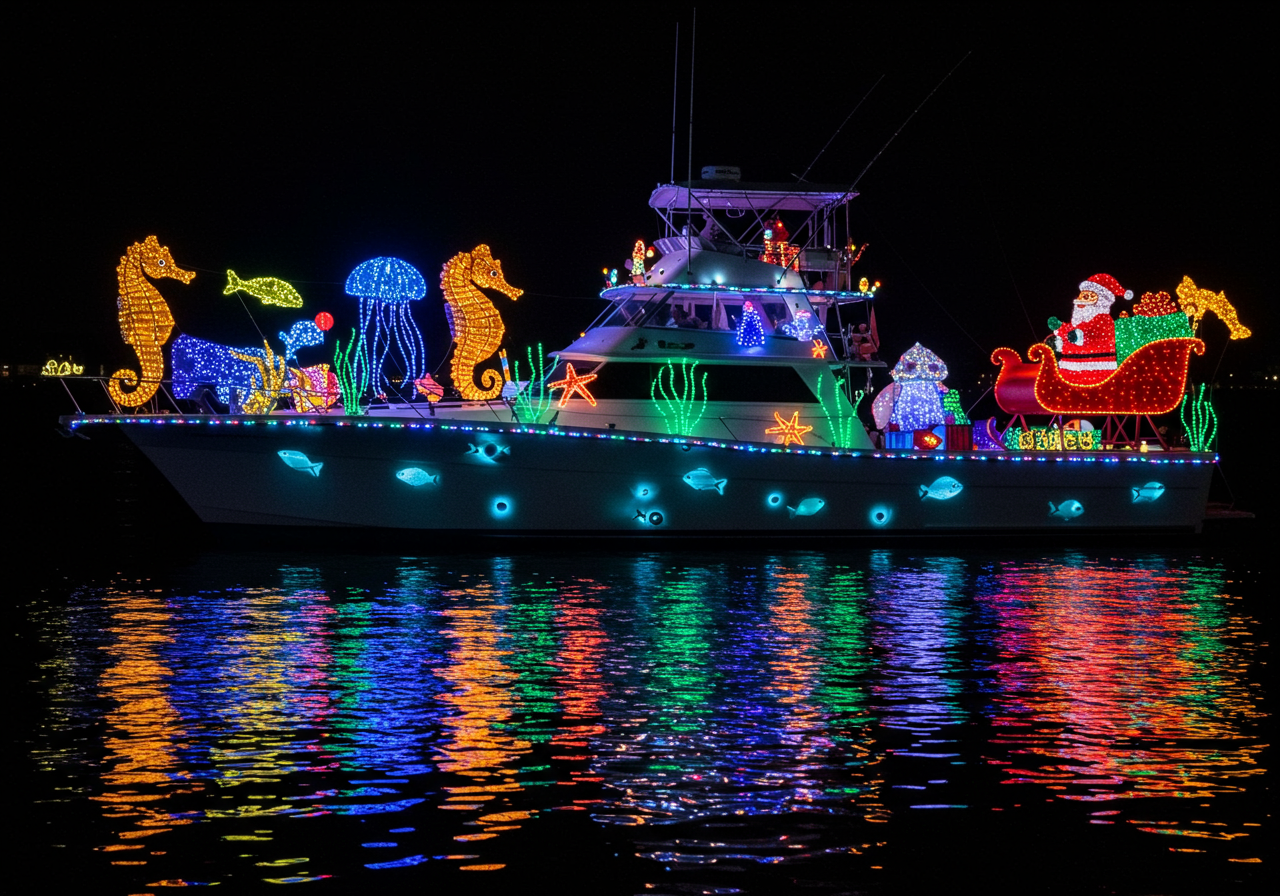 Picture yourselves wrapped in blankets on the deck of a boat, the city skyline sparkling with lights as you cruise along San Diego Bay. The water reflects the shimmering colors, and the soft glow of the festive decorations on passing ships adds a touch of magic to the night.