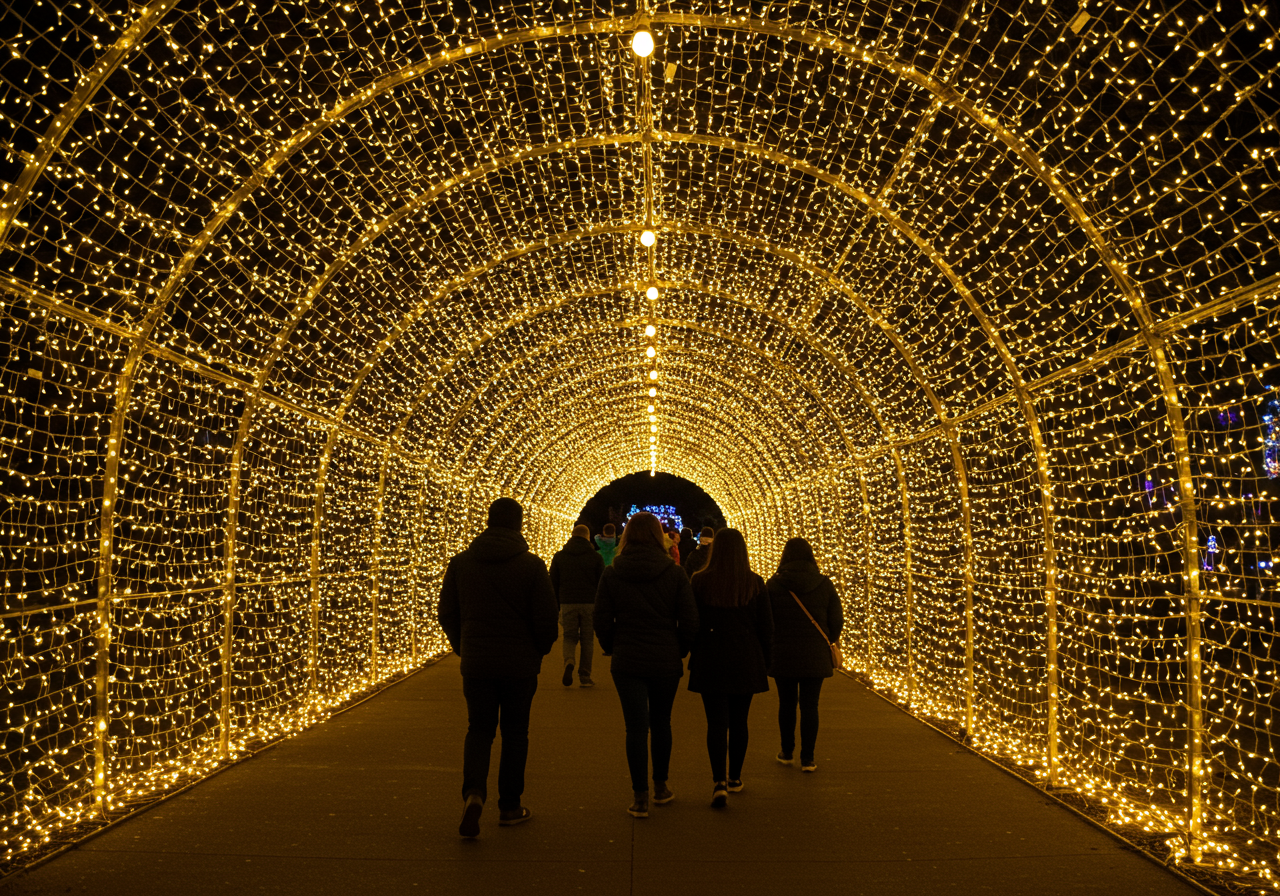 Picture yourselves strolling through an enchanted garden transformed by a kaleidoscope of colors. The pathways are illuminated by thousands of twinkling lights, creating a whimsical atmosphere. You might find yourselves pausing under the glow of a towering tree made entirely of lights, feeling the magic of the season all around.